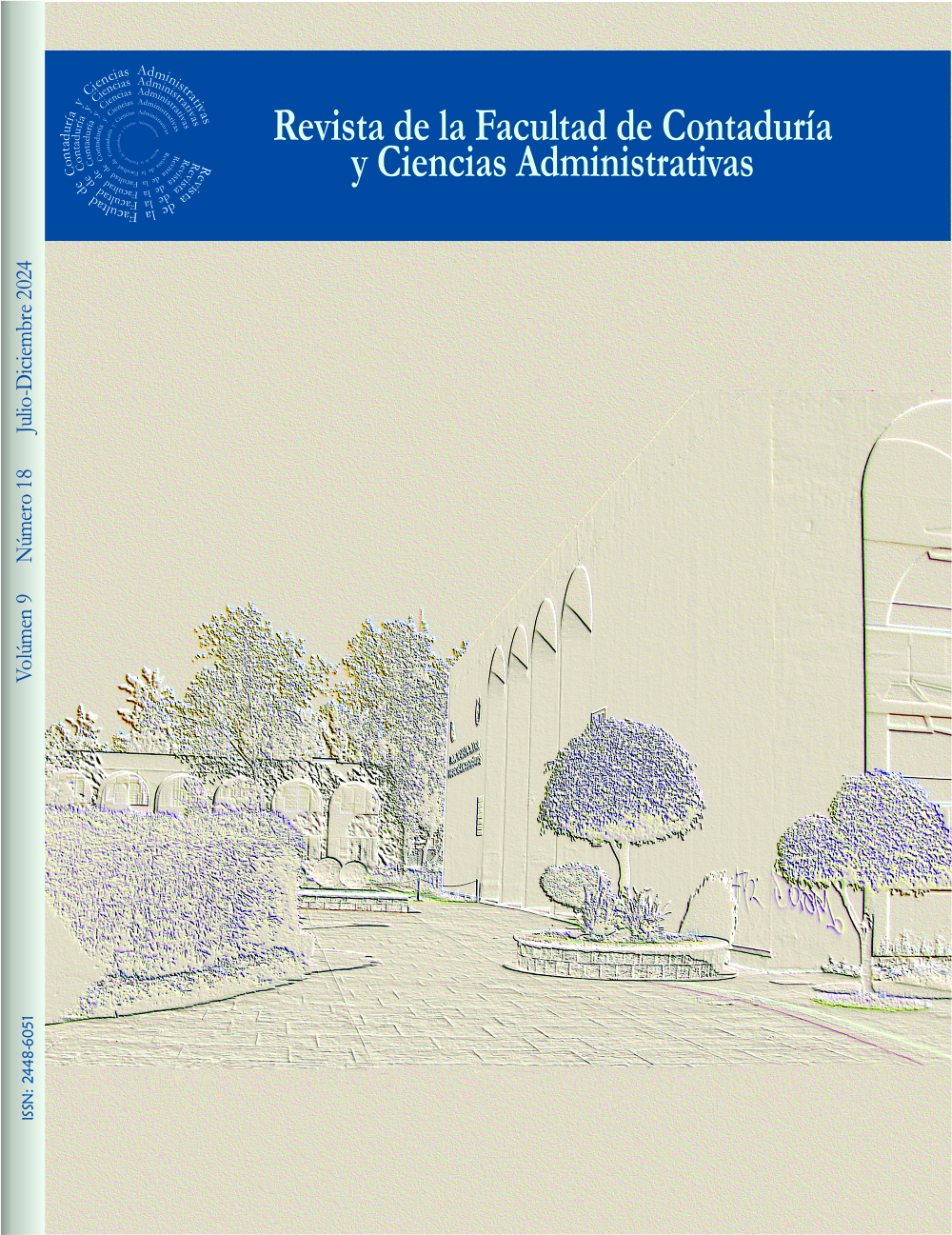 Revista de la Facultad de Contaduría y Ciencias Administrativas, Año 8, Vol. 16, julio - diciembre 2023, es una publicación semestral en formato electrónico, editada por la Universidad Michoacana de San Nicolás de Hidalgo a través de la Facultad de Contaduría y Ciencias Administrativas, Av. Gral. Francisco J. Múgica S/N, Ciudad Universitaria, Edificio AII, Morelia, Michoacán, México, Tel. y Fax (443) 3-16-74-11, C.P. 58030, rfcca.publicaciones@umich.mx, http://rfcca.umich.mx. Editor de la revista: Marco Alberto Valenzo Jiménez. Reserva de Derechos al Uso Exclusivo 04-2022-101211522700-102, ISSN: 2448-6051, ambos otorgados por el Instituto Nacional del Derecho de Autor. Responsable de la última actualización de este número Dr. Pedro Chávez Lugo, Av. Gral. Francisco J. Múgica S/N, Ciudad Universitaria, Edificio AII, Morelia, Michoacán, México, Tel. y Fax (443) 3-16-74-11, C.P. 58030, fecha de última modificación 30 de Diciembre de 2023.